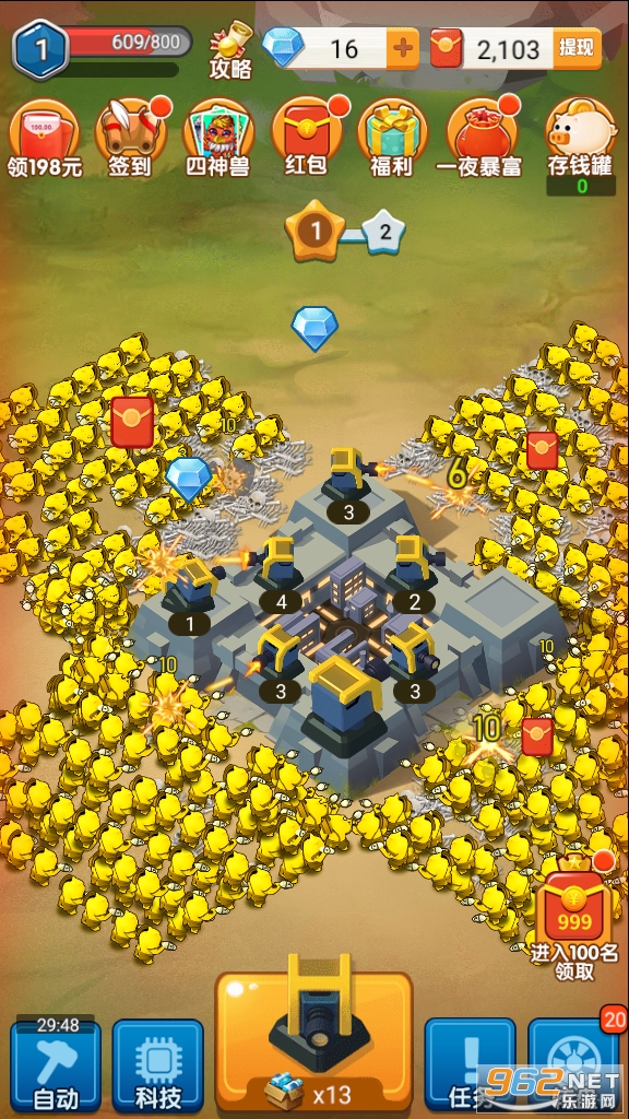 保卫大富翁红包版是一款可以挂机,可以赚钱的塔防手游,守护我们城市里面的大富翁,建造炮台,消灭万千敌人,保卫大富翁可以获得随机掉落的红包,每个红包零到几毛钱不等,保卫大富翁游戏提现也是非常的方便,在传统的塔防游戏玩法的基础上增加了奖励机制,完成游戏中的任务就可以获得大量的奖励。