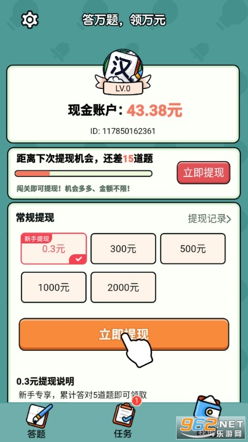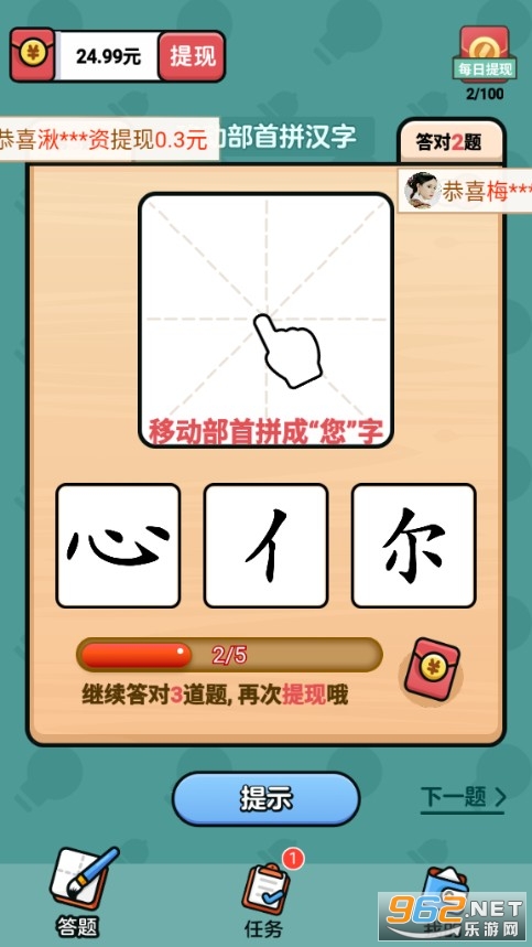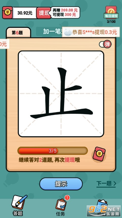 汉字题材的答题游戏,游戏主要考验的是汉字的积累,有着多种玩法,比如添加一笔来变成新的汉字、组合拼图汉字等,可以点击下面的提示来获得提示,边玩边赚钱。