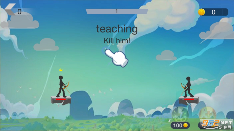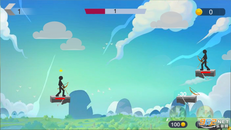1、通过拉取控制火柴人射箭的角度和力道,按的越久力道越大。