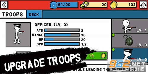一款非常有趣的休闲益智闯关游戏,游戏的操作简单容易上手,玩家将完成一系列有趣的挑战,游戏的玩法轻松有趣,在各种模式中指挥火柴人进行站哦度,不同的士兵有着不同的能力和属性,推荐给喜欢休闲游戏的玩家。