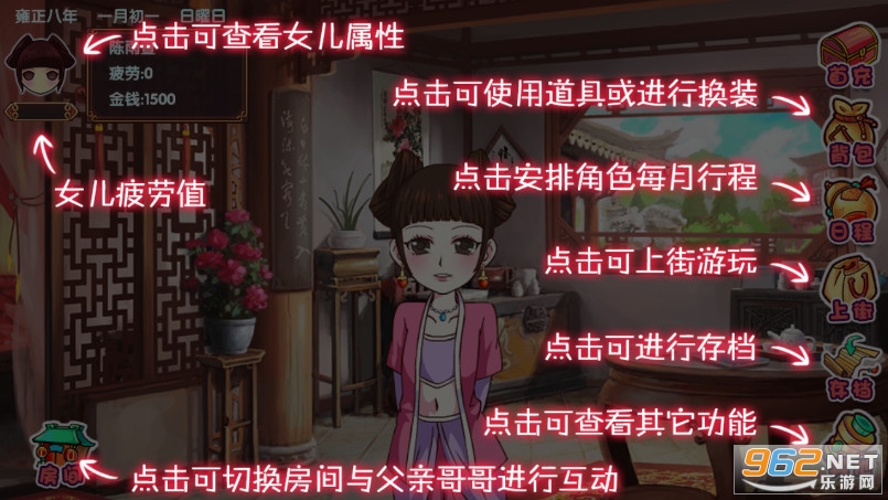 简单的游戏操作,跟其他养成类游戏差不多,玩家只需用一指点击屏幕便能完成全场操控;从对话、闲逛、读书、回家、日程、工作等等一些列孩子在成长生活中会遇到的真实经历,让玩家体会一回当古代大家闺秀的感觉,不仅是只有享福,还需要由内而外的培养整体素质。