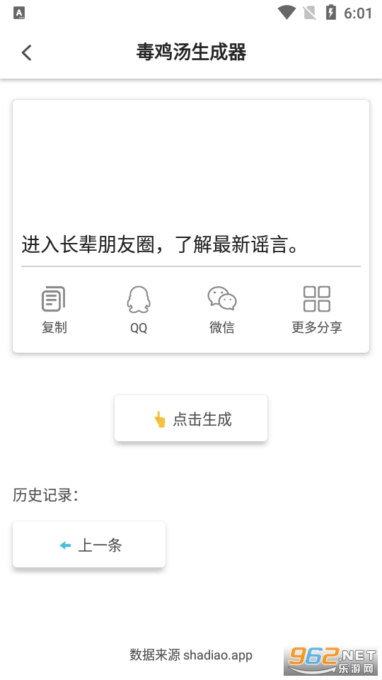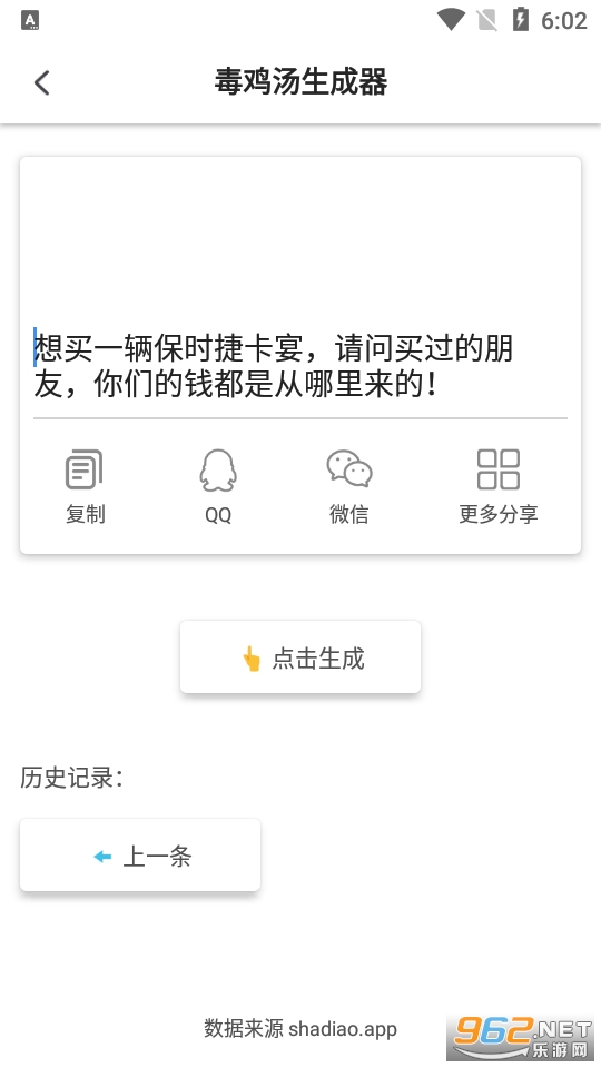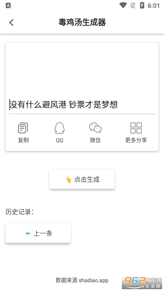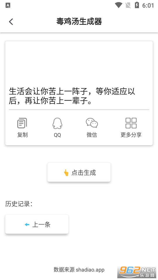 非常好用的毒鸡汤文案生成器,能够直接通过软件或者网页版的链接生成各种毒鸡汤,安卓版本的有app,ios版本的暂时只能够安装捷径使用或者直接用网页使用哦!