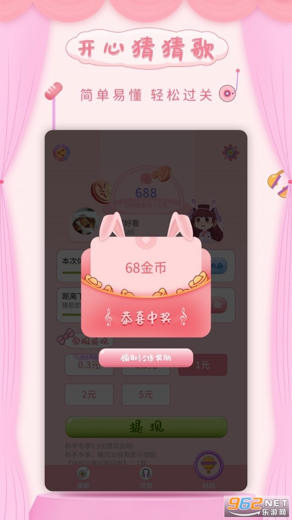 4、可以获得开心猜歌游戏多种不同的提示帮助你闯关,并让你猜的非常的准确还有机会可以赢取中级的红包福利大奖。
