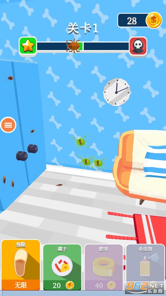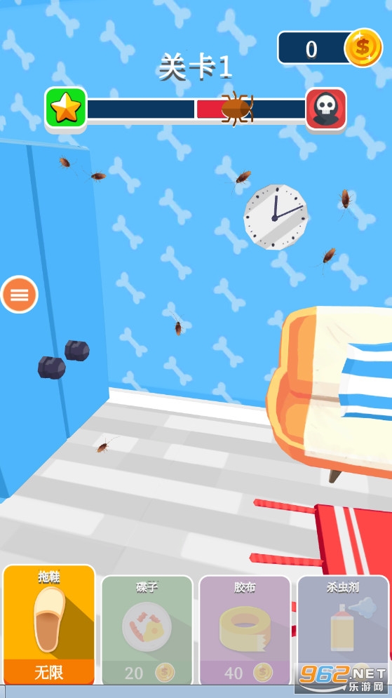 解锁新的道具,如手枪,炸药包或火箭发射器,杀死可恶的蟑螂。