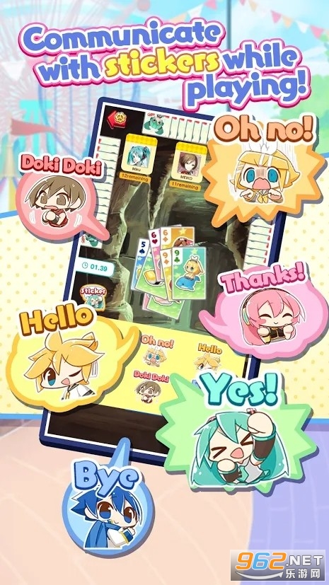 以知名的虚拟偶像歌姬初音未来为原型,设计了共二十七种不同的卡牌,每一种卡牌都有着其不同的作用,玩家可以自由进行组合,然后其他的玩家进行对战,看看谁更技高一筹。
