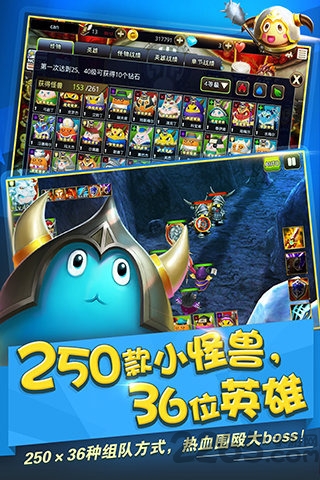 2.有250款各怀绝技的Q萌小怪兽,36位英雄领队,创新的3+6游戏战斗模式使得游戏策略性,自由度十足,给你的战斗创造无限的可能。另外,多达十二种的职业设计让你游戏路线选择多样化,各种职业风格迥异,让你每次都能有新的体验。
