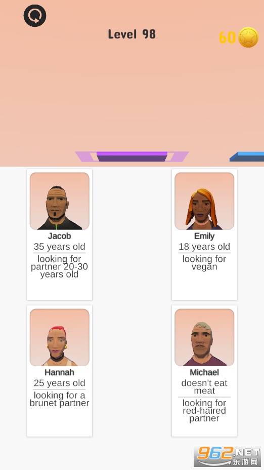 《匹配人物》(Match People 3D)是一款清新卡通风格的连线闯关游戏,在这款游戏中玩家将为人们匹配合适的对象,根据他们的要求来进行配对,游戏的玩法轻松有趣,还有着超多的关卡等你挑战,还在等什么呢?赶快下载体验吧!
