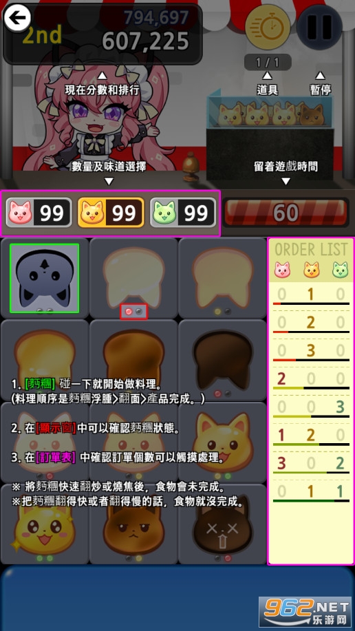 一款非常有趣的休闲模拟游戏,你需要注意各个颜色的变化,最好按照顺序来进行,这样的话可以更好的把握火候,在变色的同时就进行翻转,还需要你观察各个订单的数量,游戏的玩法轻松有趣,推荐给喜欢休闲游戏的玩家。