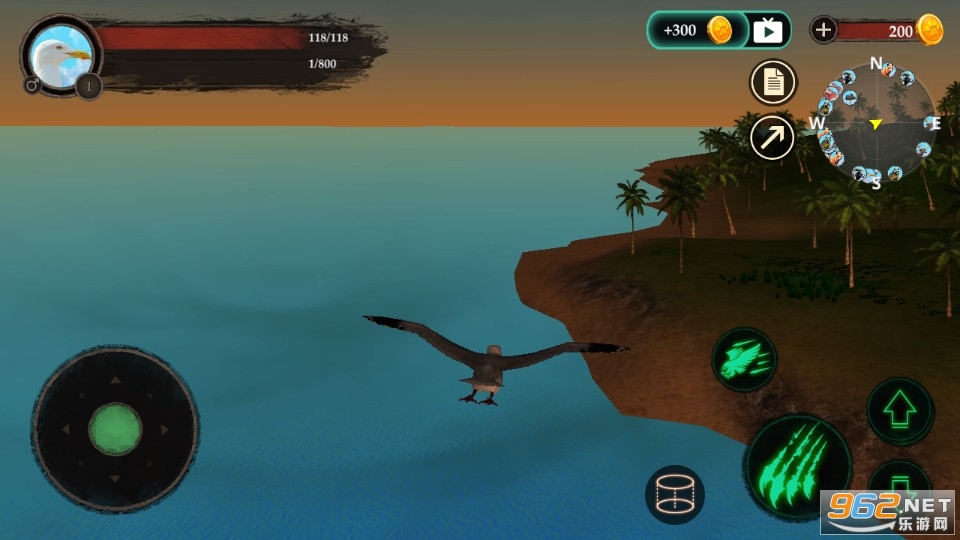 操作你的海鸥在海面上自由飞行,还能飞到远处的山丘上空,有最大飞行高度和飞行速度的,我们在玩这款模拟游戏的时候要时刻关注海鸥的身体状况,一旦需要补充体力就要去周围觅食了。