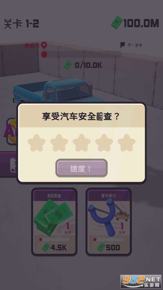 《Car Safety Check》的玩法比较简单,玩家需要做的只是将测试的车辆,向弹弓的子弹一样弹射出去即可赚取收益,获得金币。随着关卡的推进,前方阻挡的障碍也越加复杂与坚硬,这时就需要玩家借助各种方式对汽车进行强化,除了基本的强化框架之外,提升动力,升级弹弓的弹性等操作也在正常的范围之内。