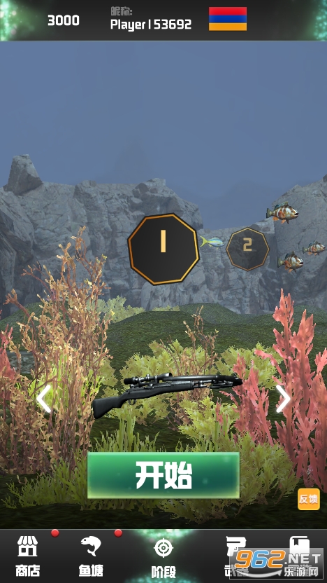 2、开始全新的水下狩猎之旅,使用各种强大的武器完成各种鱼类狩猎。