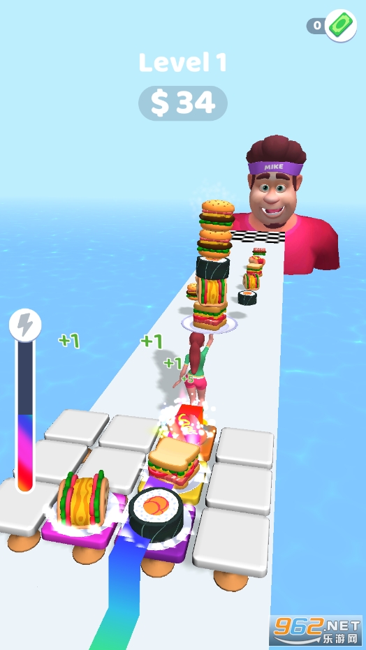 3、不断地美味的食物,制作出最大最高的汉堡包,顺利的跑到终点。