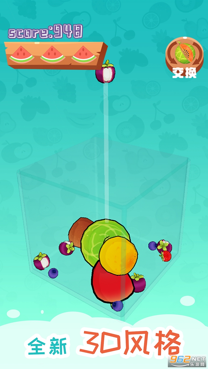 《进化水果3d版》是一款非常有趣的休闲类合成游戏,游戏采用了当下热门的合成大西瓜游戏的玩法,玩家们可以根据游戏中的水果品种进行合成哦,在3d的玩法中想要两个水果相互碰撞不是一件容易的事情,需要耐心的瞄准才能结合哦