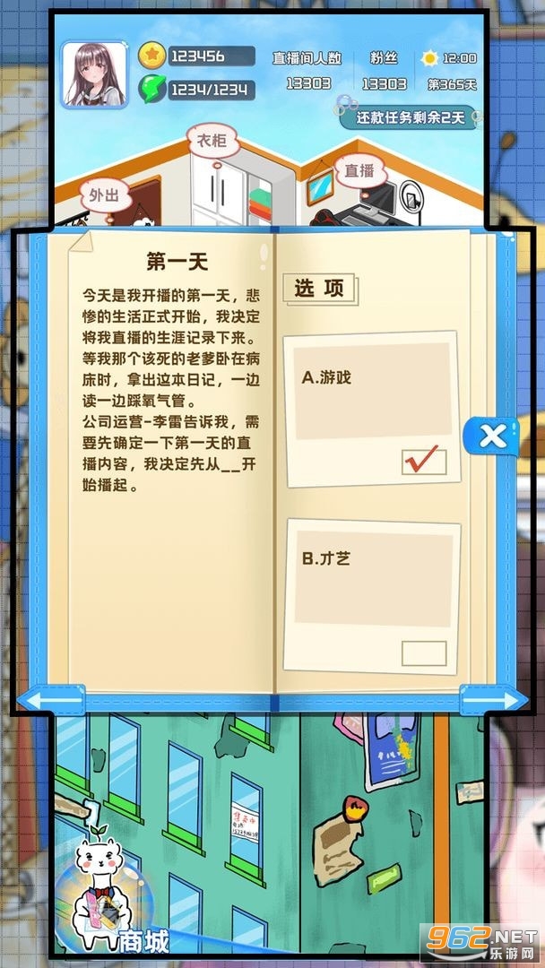 在很多人的眼中,主播是一个很吃香的职业,不仅能赚到很多的钱,而且不怎么费心,每天都能做自己喜欢的事情。今天我们将会展现出不同的一面,开始你为期一年的直播生涯,记录下每天的点点滴滴,真实模拟出生活中可能发生的所有事情,看看你能否成为知名的网红。