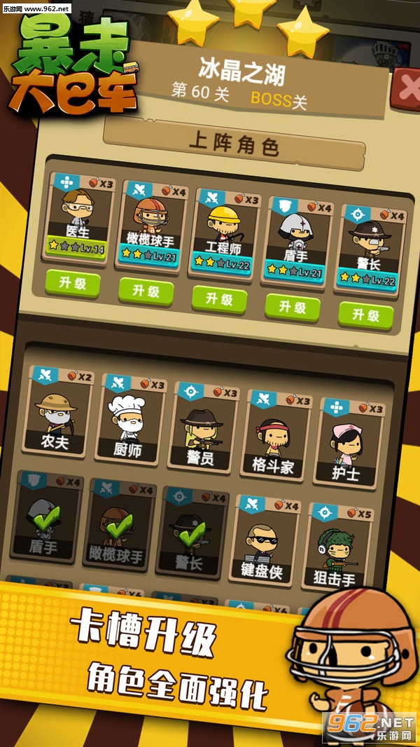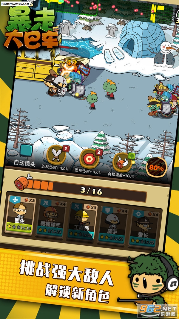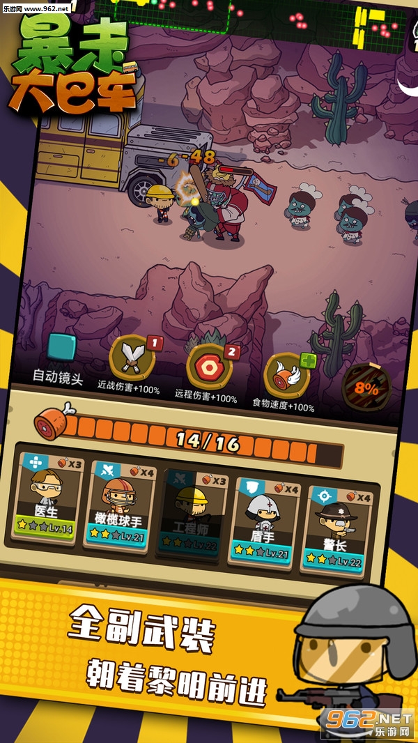 游戏闯关过程会有不同强度的僵尸出现在关卡中,玩家驾驶一辆大巴车来到关卡中,他需要通过消耗食物召唤战士通过僵尸的层层阻碍,最终成功清除路障,方可成功过关,僵尸也会向大巴车的方向进行移动,当大巴车被僵尸攻击至生命值为零时,则关卡失败。