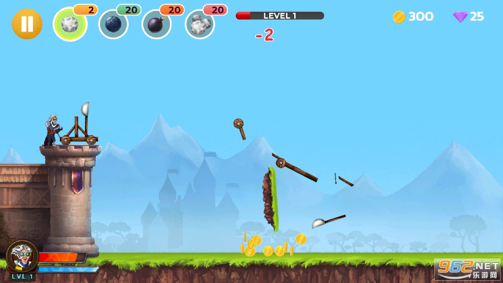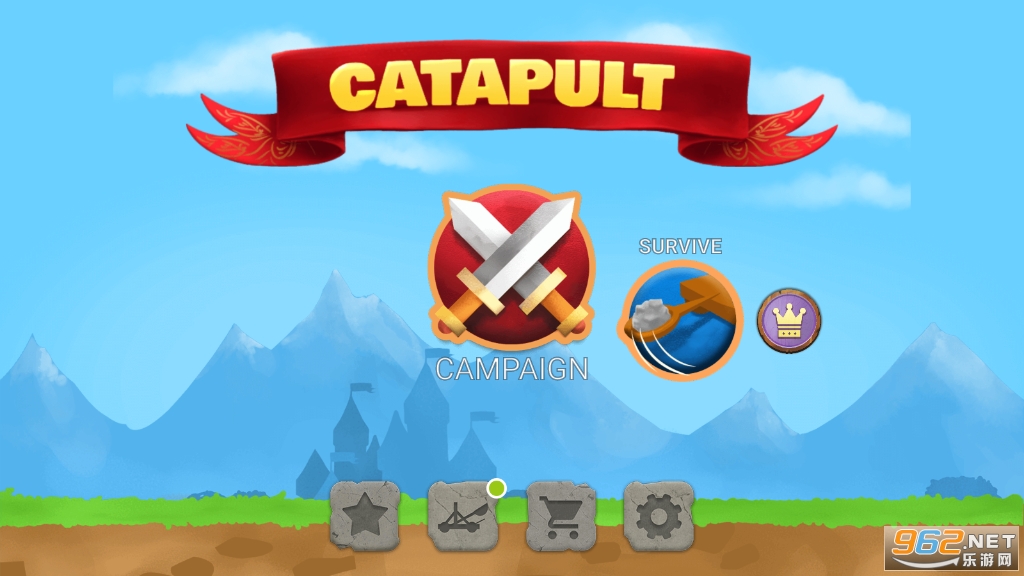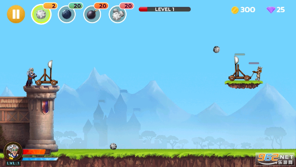城堡塔楼上放置一个巨大的弹射器,向敌人投掷石块和炸弹并摧毁敌对的弹射器。