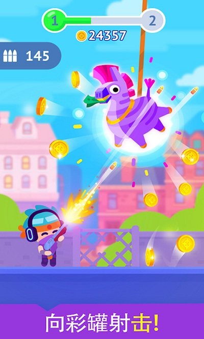 玩家需要使用手中的武器击碎悬浮在空中的彩罐获得金币,在商城中有着很多的武器,积攒金币解锁更强大的武器,