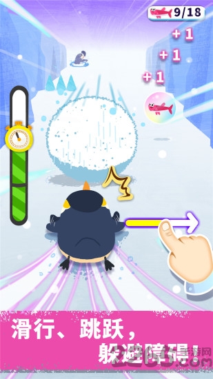 帝企鹅的饭后娱乐——滑雪开始啦!宝宝帮助企鹅越过石头、躲避海豹、绕开雪球。耶!成功吃到小鱼,加速滑行!