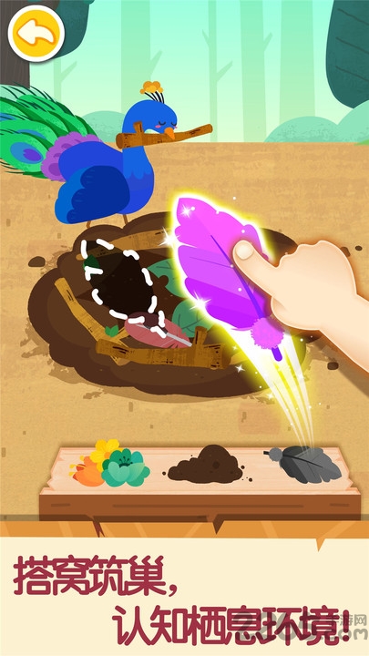 孔雀公主想住在林间草地,宝宝帮它打造舒适的家吧!先收集树枝、羽毛,用树枝拼搭出圆形的窝,接着铺满羽毛。孔雀公主的新家完成!