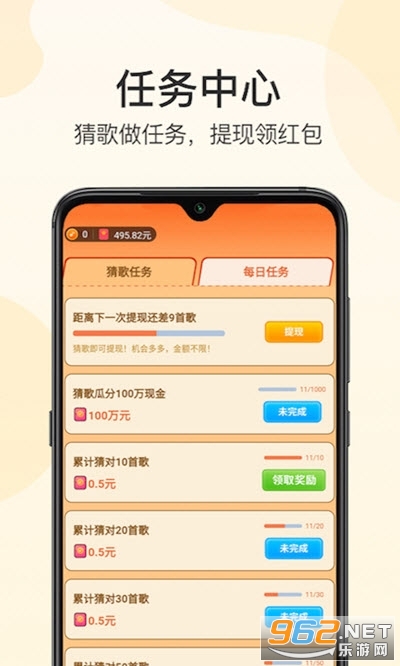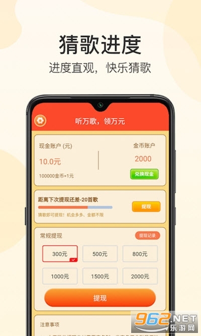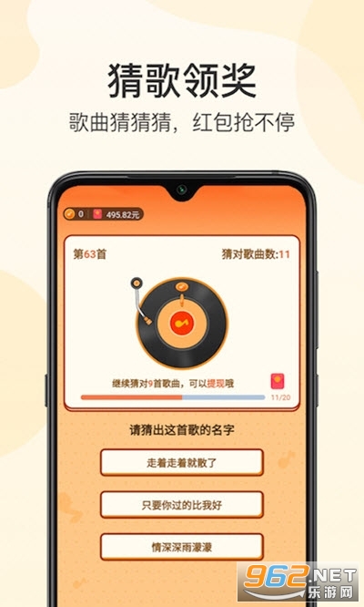 一款休闲益智赚红包手机游戏。游戏里包含了超多的各种经典歌曲、流行舞曲,通过听歌识别歌曲名称,猜对就有奖励,一款可以边享受边赚钱的游戏,还在等什么。听歌享受的同时还能获取红包奖励,提现速度超快,即时到账。签到领取金币,达到一定数量可以兑换红包。