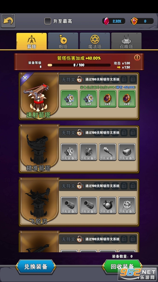 《大侠请重新来过:塔防游戏》是一款将合并与塔防元素相结合的趣味手游,游戏中玩家可以解锁箭塔、炮塔、魔法阵等各种不同的武器来布置自己的防御阵型,抵御敌人的一波波攻击,可以将两个相同的武器合并来获得更强力的武器,可以利用材料升级强化提高攻击力。