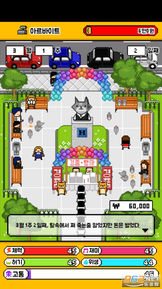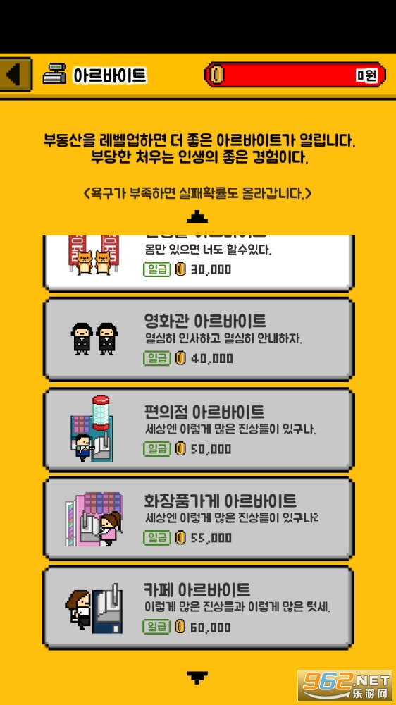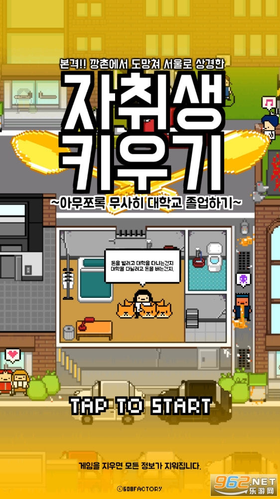玩家在游戏中将会进行模拟挑战。这款游戏模拟的是一个韩国贫苦的大学生的生活。游戏中玩家将帮助塔进行各种生活上的的安排,以及人生的规划,帮助他能够获得更好的人生。