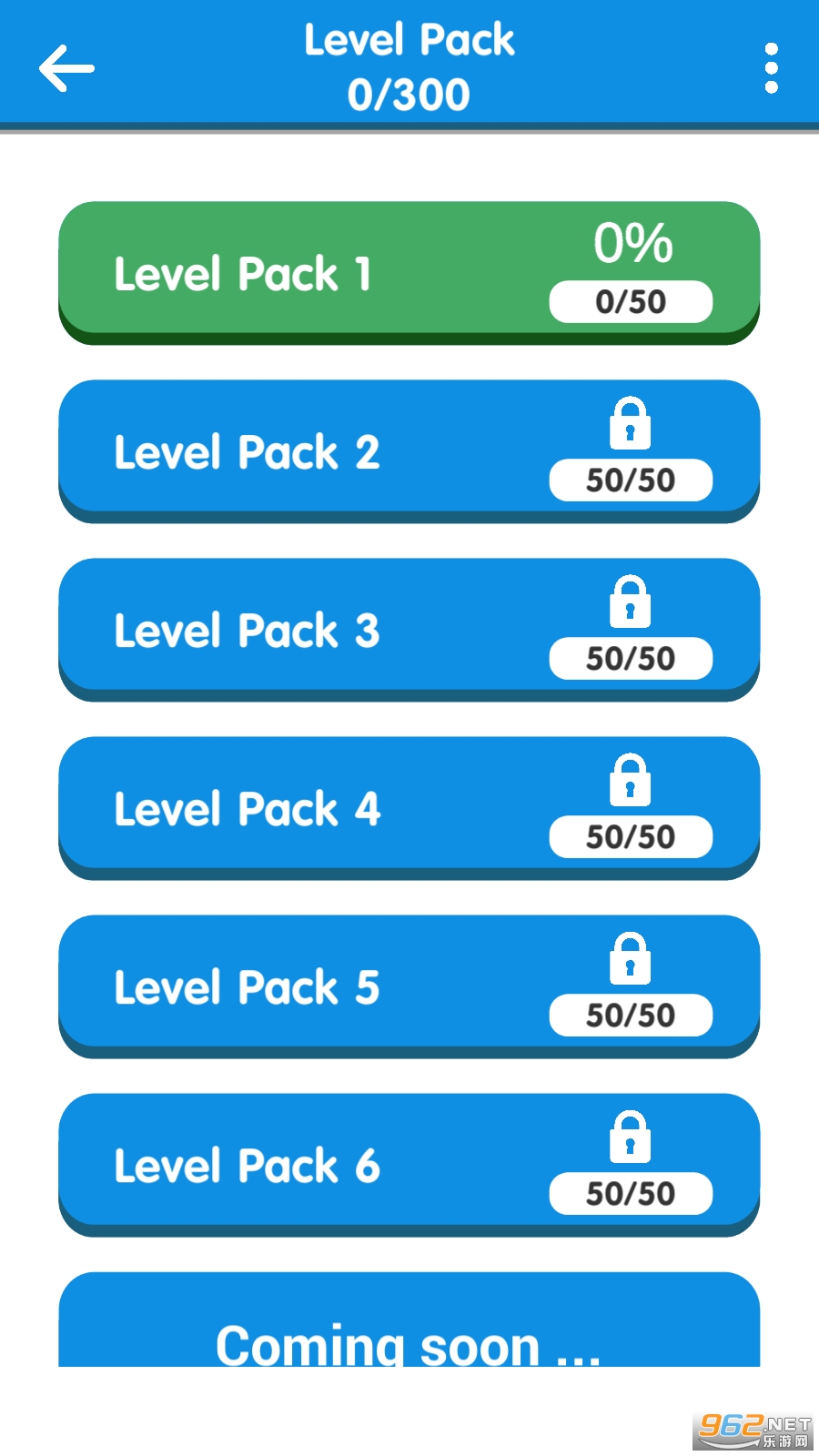 游戏有6种难度级别,每种难度都有50关,总共三百个关卡,随着难度提升,需要考虑的事情也就越多,最开始只是简单的连在一起,后面就需要更多的思考才能完成。