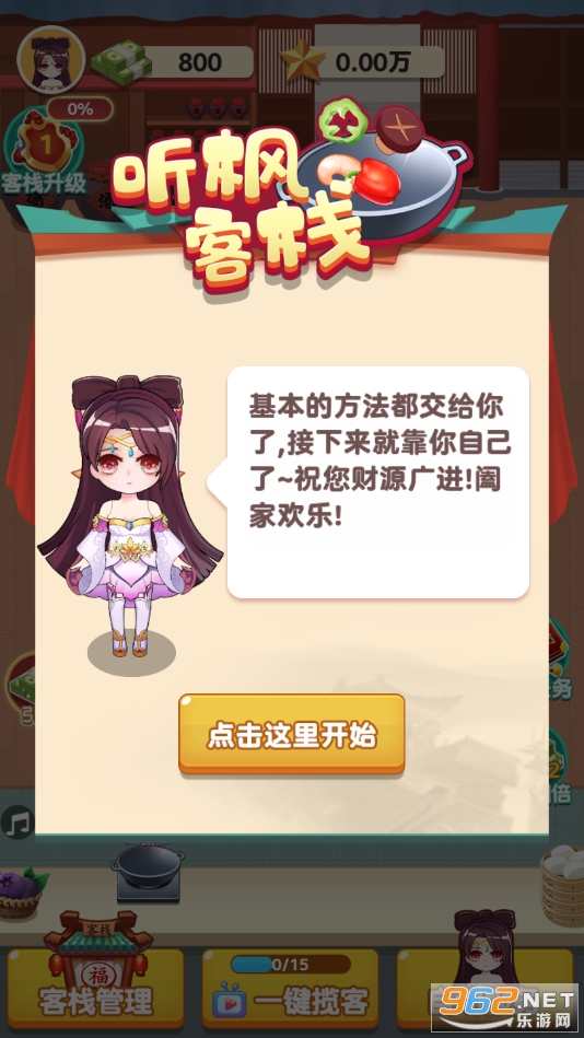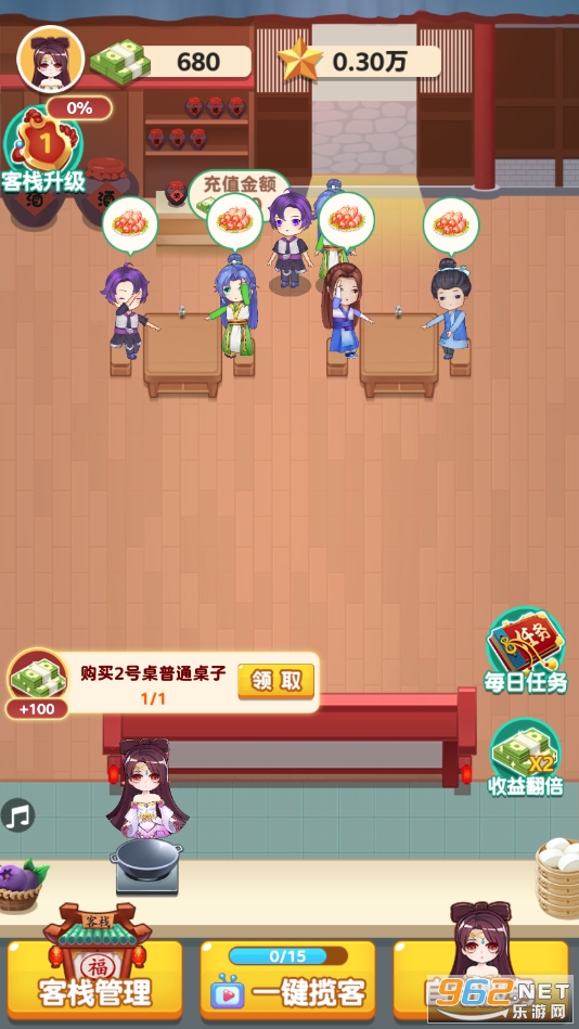 1、客栈管理:随着升级购买柜台、餐桌、绿植、摆件等场景道具,丰富大堂布置;