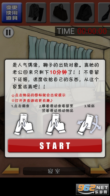一款情节特别的限时找物类解谜游戏。玩家将扮演人气偶像麻里子的外遇对象,跟日本的综艺节目有点相似,一夜缠绵之后,麻里子的丈夫将在10分钟后回到家!在10分钟的限制时间内(游戏画面的右上方会显示剩余时间),玩家需要集齐自己的全部物品,并消除所有证据。
