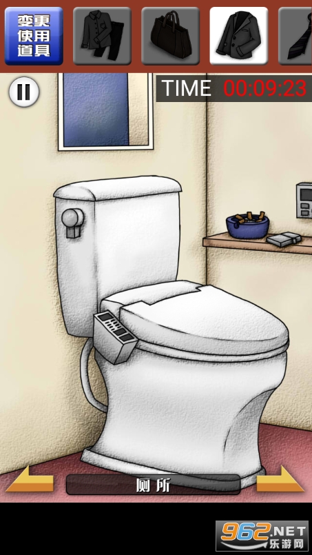 首先按一下马桶的冲水按钮,然后点击马桶水箱的盖子打开,里面有【眼镜】。然后回来,马桶旁边的架子上可以拿到【烟屁股】和【打火机】。