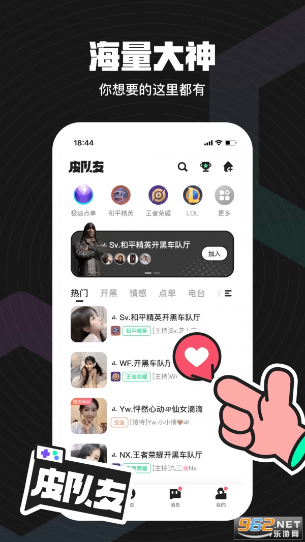 不想被猪队友拖累,就赶紧下载无双队友,超多小姐姐、小哥哥等你来pick,快来找属于你的心动声音,多人连麦,房间玩法丰富多样,帮你找到志同道合的小伙伴~