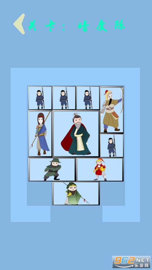 华容道游戏取自著名的三国故事,曹操在赤壁大战中被刘备和孙权的“苦肉计”、“火烧连营”打败,被迫退逃到华容道,又遇上诸葛亮的伏兵,关羽为了报答曹操对他的恩情,明逼实让,终于帮助 曹操逃出了华容道。