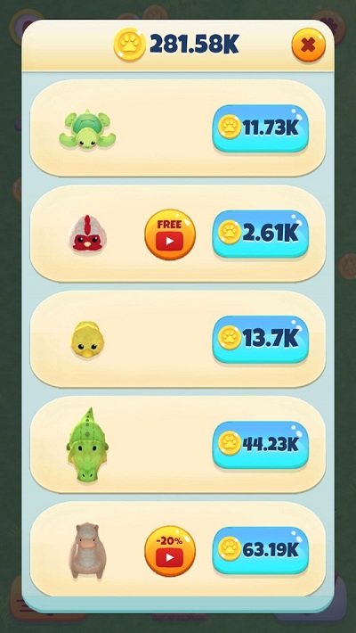 游戏以卡通的画风给您展现出来,里面含有多种不一样的小动物,游戏中的玩法和乐趣也是丰富多样。所有的动物的造型都非常的可爱治愈。您可以控制属于您的小动物们合成进化出更多新奇额的小动物。合成的级别越高,他们为您获得的奖励就越丰厚,快来下载体验吧!