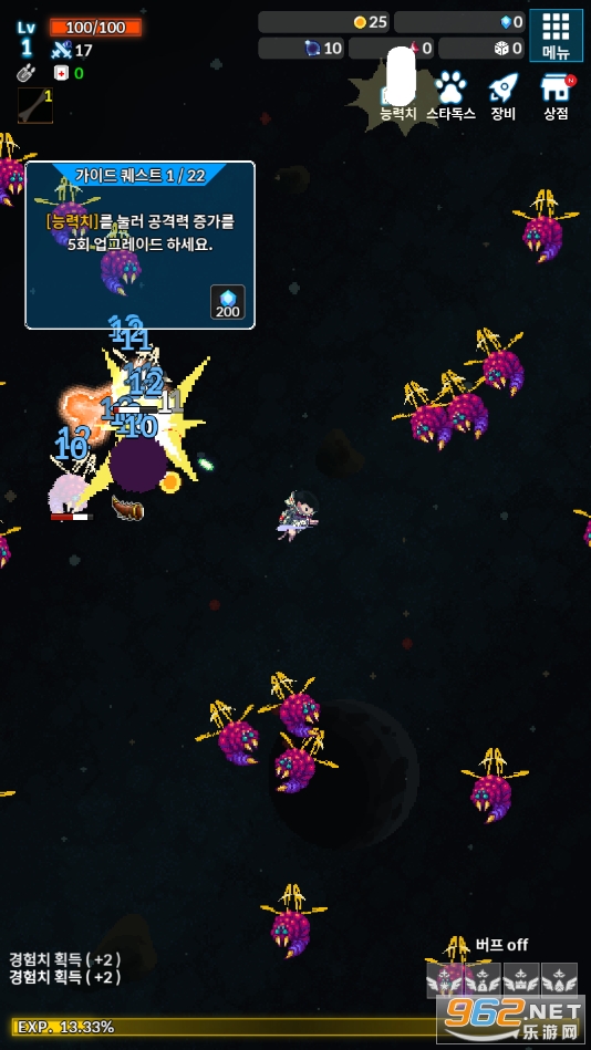 游戏中的主要战斗方式,是操控着你选择的可爱小狗进行射击,跟以往的太空射击题材非常的相似,注意拾取游戏中掉落的武器强化道具,合理的使用它们能够让你更快的解决战斗。