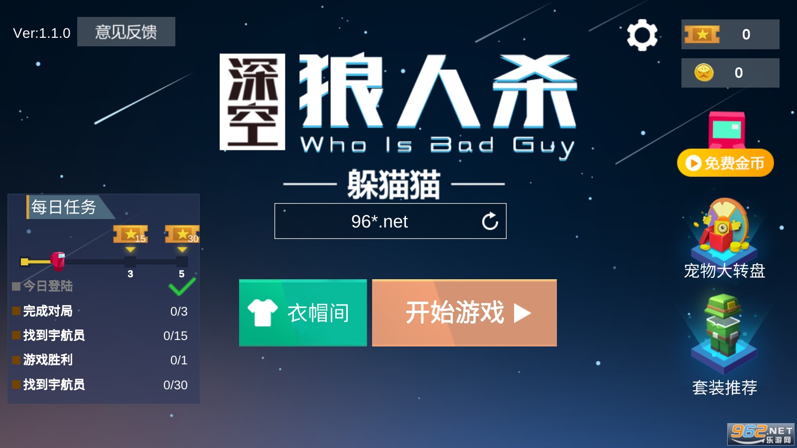 《深空狼人杀躲猫猫游戏》是一款超好玩的多人竞技类的休闲游戏,在游戏中被分为两个阵营开始你的躲猫猫体验。画面简约可爱,选择你喜欢的宠物以及装扮,比较考验玩家的逻辑能力以及演戏水平。喜欢的话就快来下载吧!