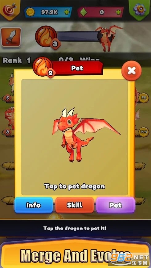 《合并龙大师》是一款全新的放置合并游戏,成为火龙训练师,去解锁更多品种的火龙,从小开始培养,还能将相同品种相同等级的火龙进行合成,去合成更高阶的火龙,升级版火龙体型更加庞大战斗力也更强,当我们龙的数量达到一定数量值时就可以创建自己的龙战队了。