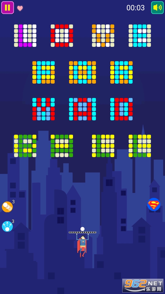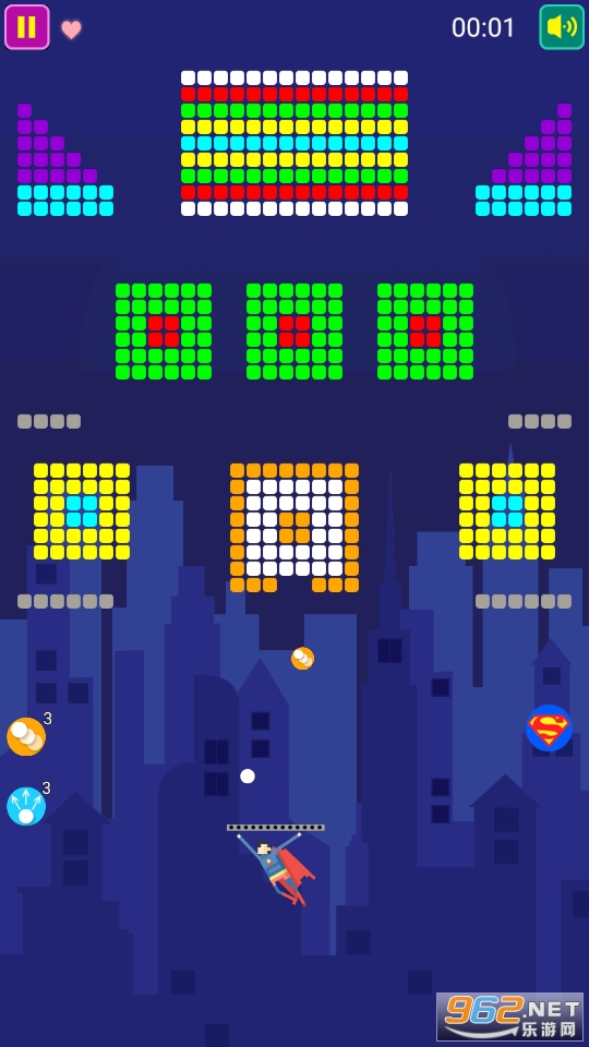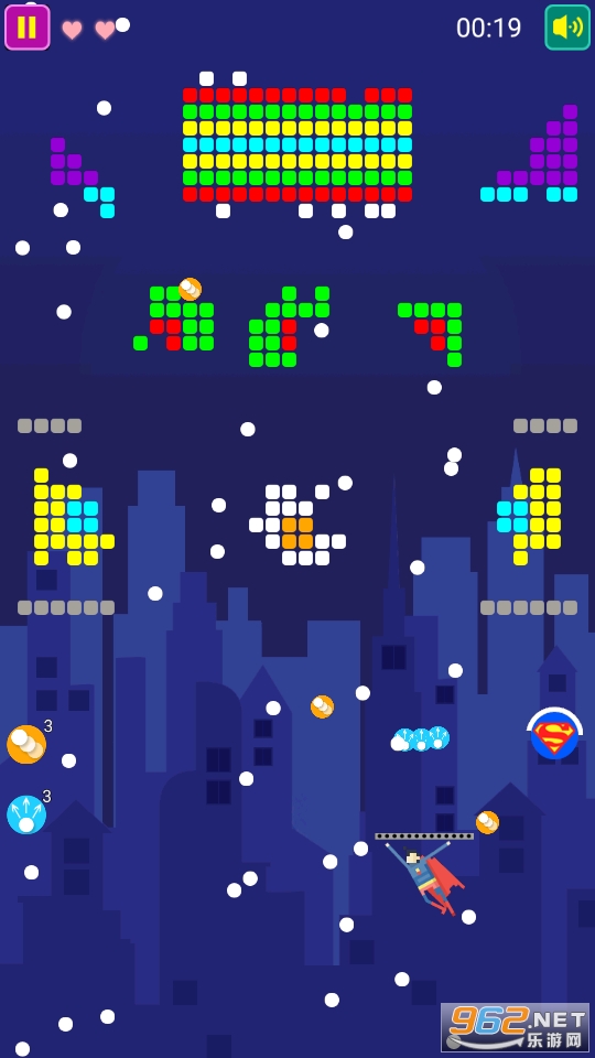 1.破砖趣味游戏,会有各种各样的砖块连续掉落,小心移动垫子才能取胜。
