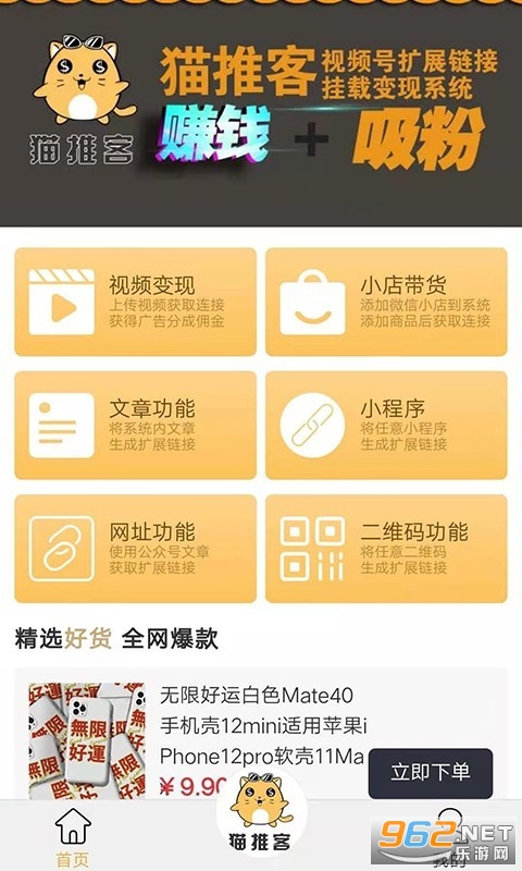 《猫推客app》是一款轻松给力的短视频赚钱平台,简单的赚钱方式方法,通过一边刷短视频一边赚红包,福利也不错,赚钱也轻松,感兴趣的小伙伴还在等什么?快来962下载试试吧!