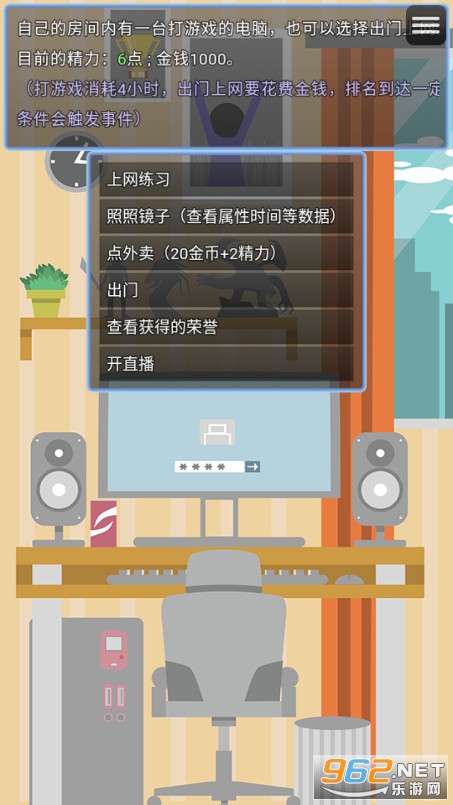 家中(单排上分)提高排名、家中直播(需要火星人主机,外设店购买,注意:会消耗当前所有精力值)挣钱(需要较大粉丝基数收入才会较高),针对训练提高属性