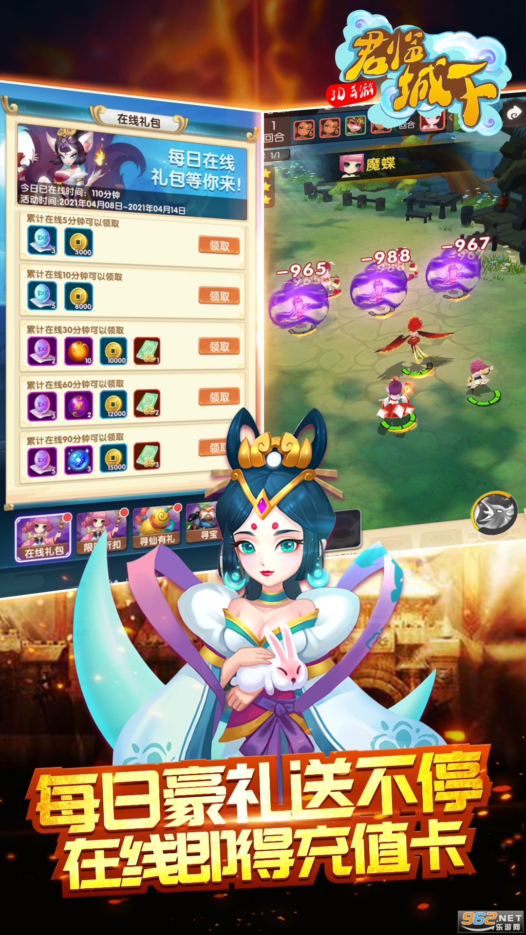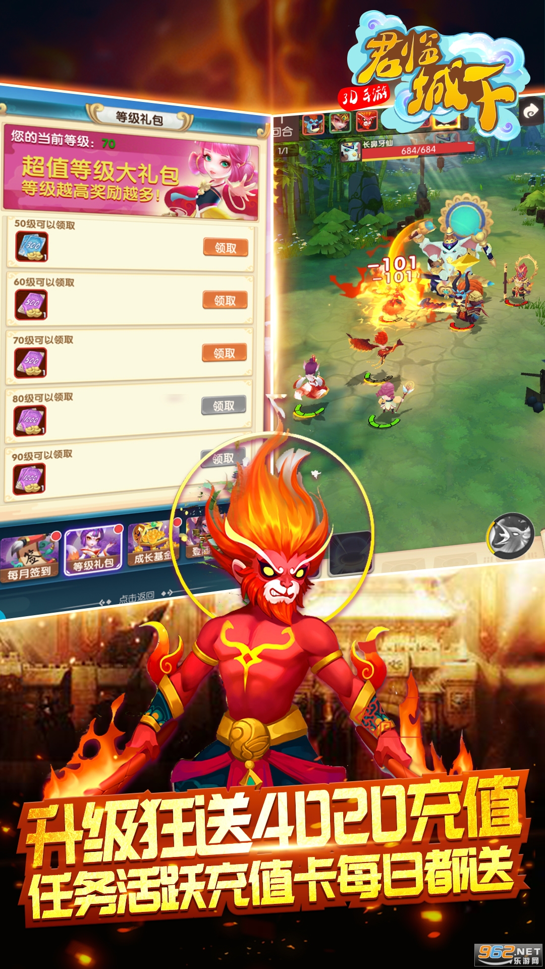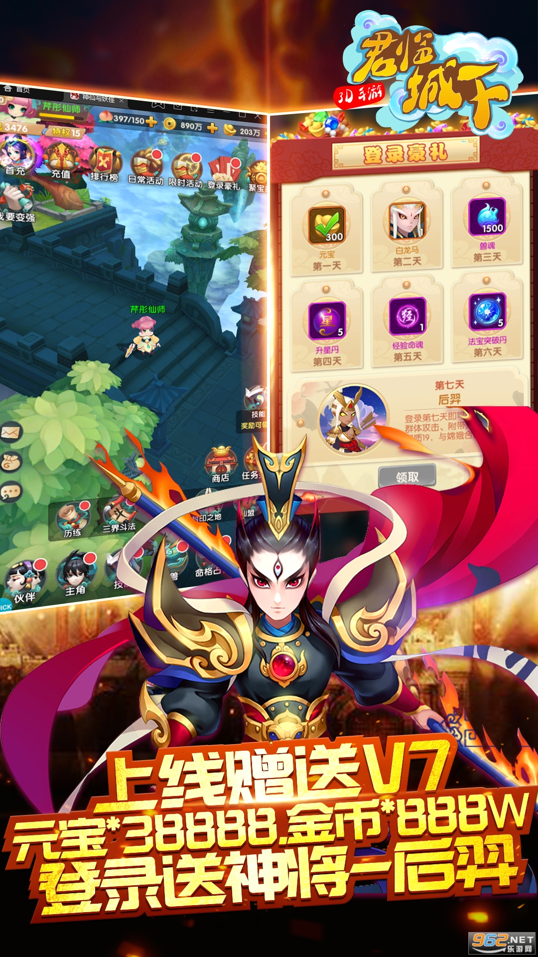 游戏以中国神话背景,原创新颖的游戏故事剧情,《君临城下》游戏主要讲述了在孙悟空被压五指山期间,玩家作为天选之人,携带至宝五彩神石降生混乱的三界中,对抗六耳妖帝的漫长旅程。 升级累积送4020充值卡。 每日登录签到就送充值卡。 办理月卡和终生卡每日登录领取大量元宝。成长基金累积送50w元宝! 完成每日活跃任务还可得40充值卡!