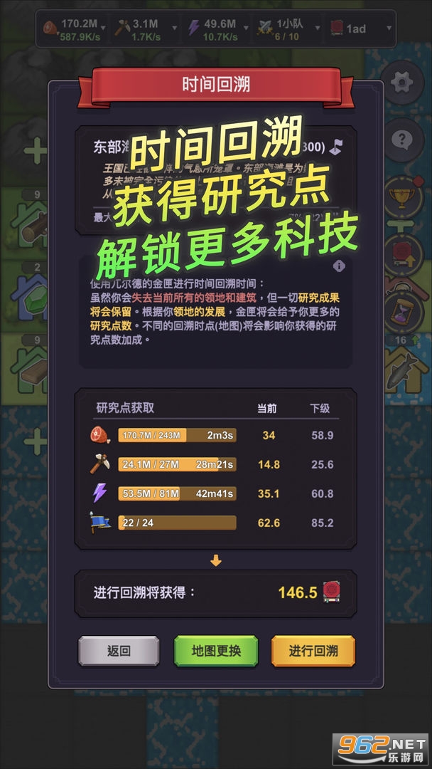 2、利用时间回溯不断累积经验和知识,解锁和升级各种精灵科技,获得更多类型的建筑和兵种。