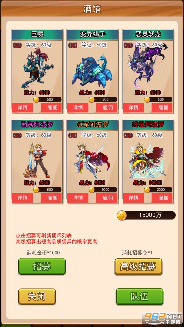 3、每天更新的佣兵系统让你每次都有新体验,快来招募你心仪的强力佣兵。