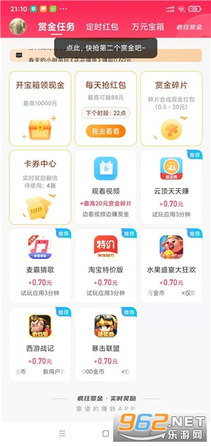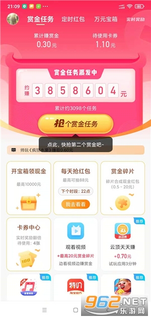 1、新用户下载注册疯狂赏金app后,根据提示“抢个赏金任务”即可获得现金红包