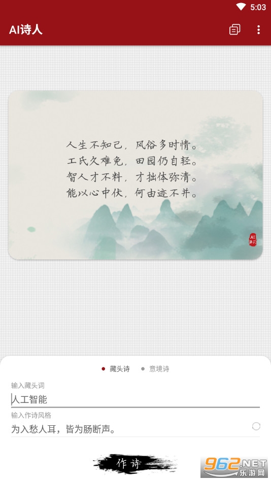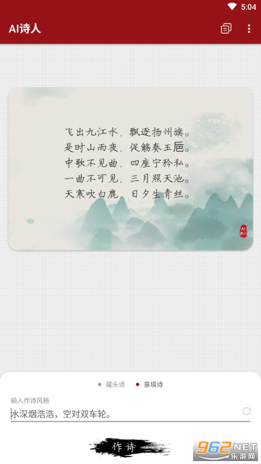 《Ai诗人app》是一款为朋友们打造的智能作诗的软件,诗词可以展现一个人的才华,朋友们可以使用本款软件来一键生成藏头诗和意境诗,让你在朋友间更有面子,操作简单,藏头诗需要输入自己想要的藏头,然后点击下面的风格,在点击作诗即可,选择不同的风格可以作出不同的诗。