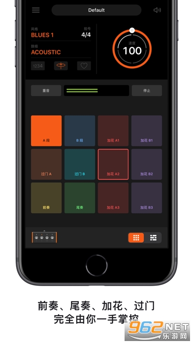 每种节奏型包含 12 个节奏乐段,包括主歌、副歌、六种加花、两种过门、前奏和尾奏,你可以通过 12 个鼓垫自由控制这些乐段的演奏。