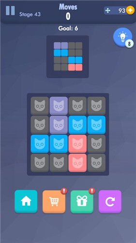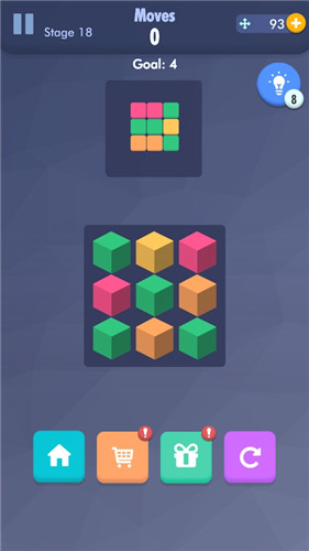 2、烧脑规划方块移动线路,灵活匹配进行消除,烧脑完成通关挑战。