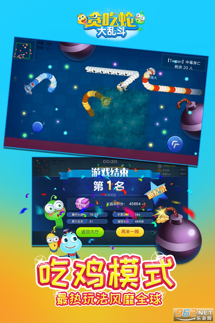 《贪吃蛇大乱斗》是一款休闲竞技游戏,游戏拥有Q萌画风,绚丽皮肤,拥有经典玩法,吃鸡玩法等,操作简单,玩法有趣刺激。