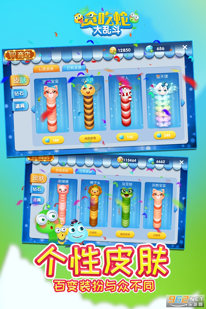 超可爱的Q萌画风,满地图铺满鲜艳水果,皮肤更是绚丽多彩,蛇蛇新装个性十足!