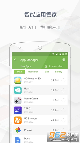 批量管理手机应用,无需Root卸载预装软件,释放更多电量和内存。
