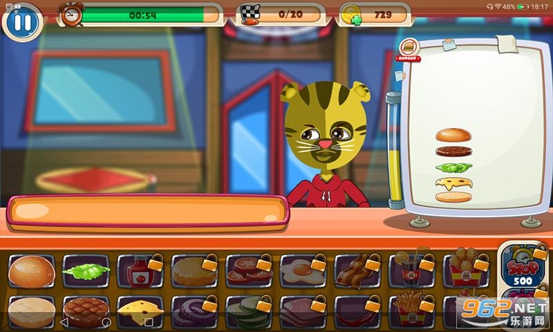 《虎厨汉堡游戏》(Tiger Chef Burger)是一款画面清新卡通的汉堡店经营休闲手游,游戏中玩家将拥有者一个汉堡店,而且招募了一个老虎厨师来帮助自己制作汉堡,有着大量的顾客来往,玩家需要按照顾客的订单来制作各种各样的汉堡美食。